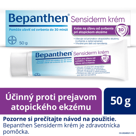 Je účinný proti prejavom atopického ekzému, ako sú svrbenie či začervenanie. Bepanthen Sensiderm krém prináša úľavu od svrbenia do 30 minút. Je vhodný pre celú rodinu. Prináša úľavu od príznakov atopického ekzému, ako sú svrbenie či začervenanie. Bepanthen Sensiderm krém prináša úľavu od svrbenia do 30 minút. Úľava od svrbenia môže poskytnúť až 7 hodín nerušeného spánku deťom a ich rodinám. Vhodné pre deti od narodenia*, tehotné a dojčiace ženy a takisto na dlhodobé používanie. *Bepanthen Sensiderm krém je možné bezpečne používať u detí od narodenia, avšak v prípade dlhodobého používania alebo použitia na veľkých plochách sa poraďte so svojím lekárom. Pozorne si prečítajte návod na použitie. Bepanthen Sensiderm krém je zdravotnícka pomôcka.