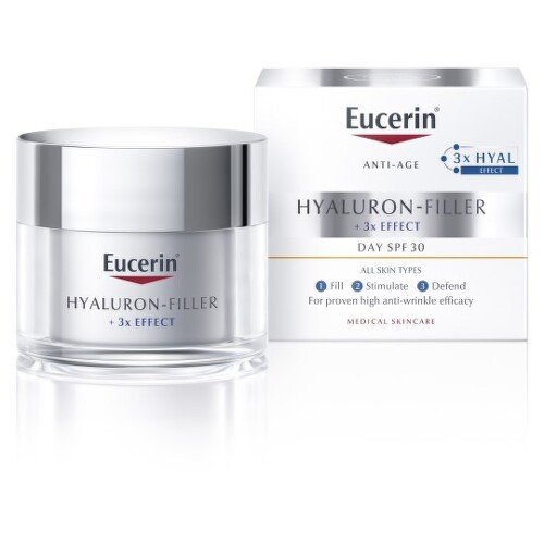 Eucerin Hyaluron-Filler Denný krém SPF30 si poradí s prvými známkami starnutia normálnej a zmiešanej pleti. Viditeľne vyhladzuje jemné línie a vrásky, omladzuje vzhľad pleti a chráni pleť pred predčasným starnutím vyvolaným UV lúčmi.