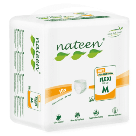 Zdravotnícka pomôcka. Nohavičky plienkové nateen FLEXI SOFT M sú anatomicky tvarované, vhodné na ťažkú inkontinenciu moču a stolice. Sú určené pre mobilných aj imobilných pacientov. Zabezpečujú pocit sucha, trojité absorbčné jadro zvyšuje schopnosť absorbovať tekutiny a zápach, sú priedušné, vyrobené z netkanej nealergénnej textílie.